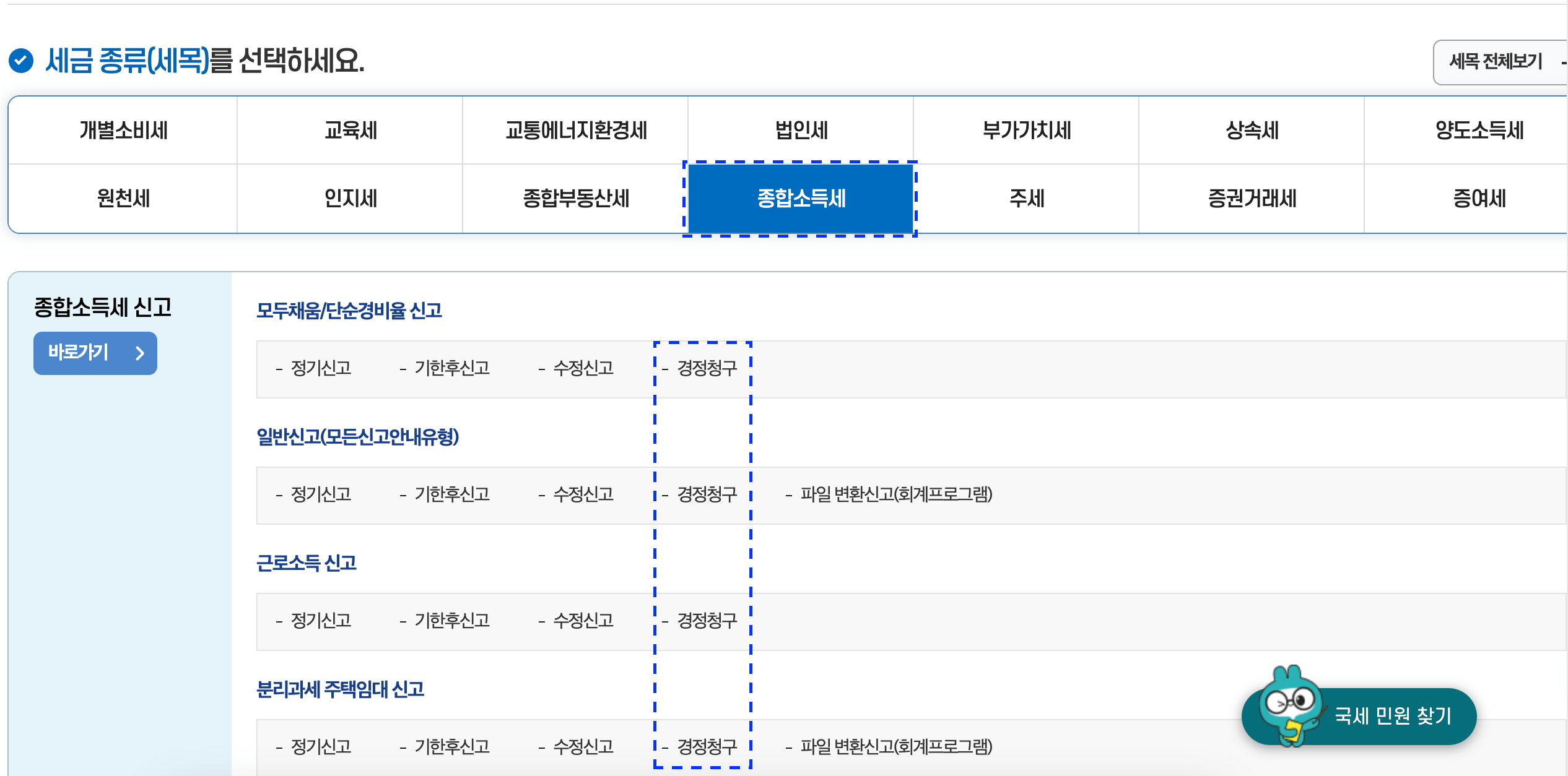 세금 신고 페이지에서 각 항목에 해당하는 경정청구를 선택하여 진행할 수 있습니다.